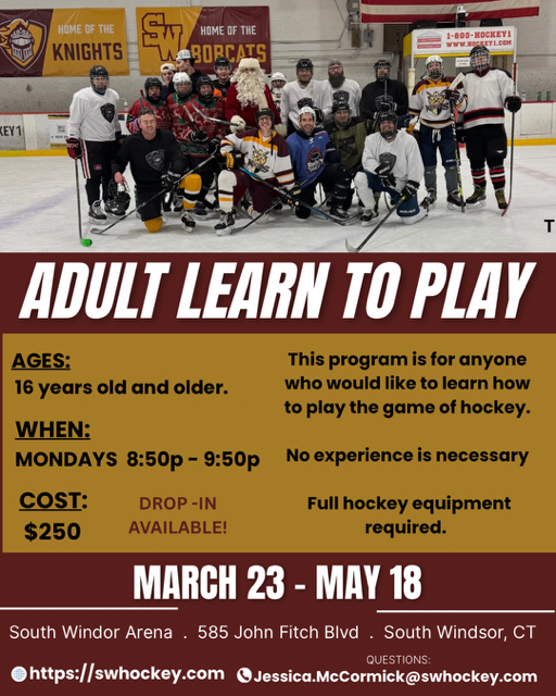 Come join our SW Hockey coaches with the spring offering of our co-ed Adult Learn to Play! Hockey is for everyone, including those taking up the game as adults!